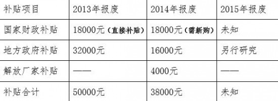 以上海为例:车主报废2007年注册登记的重型载货车换购解放J6P牵引,2013-2015年不同年份报废所享受的补贴如下: